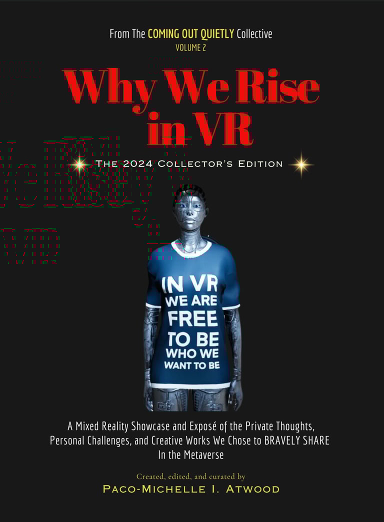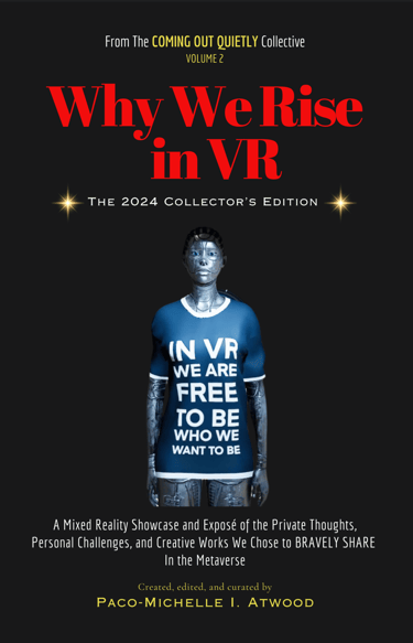 Why We Rise in VR is a Mixed Reality Showcase and Expose of the Private Thoughts, Personal Challenges, and Creative Works that Contributors chose to BRAVELY SHARE...in the Metaverse, and now, in real-life!
